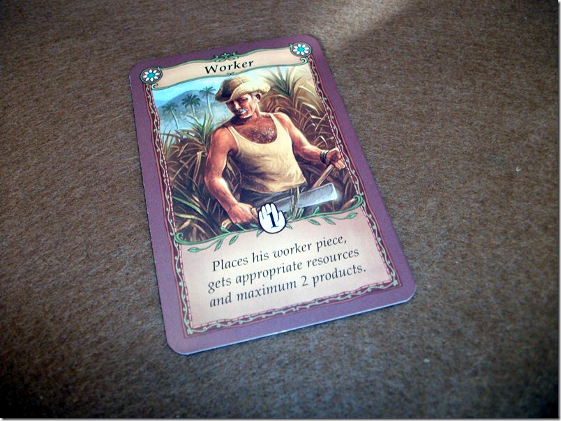 La figurita es tu trabajador. Sus idas y venidas por tu tablero van a poner tus neuronas a hervir. La fichita redonda sirve para marcar tus puntos de victoria. Hay dos errores en la foto. Chupito de ron para el primero que los detecte.